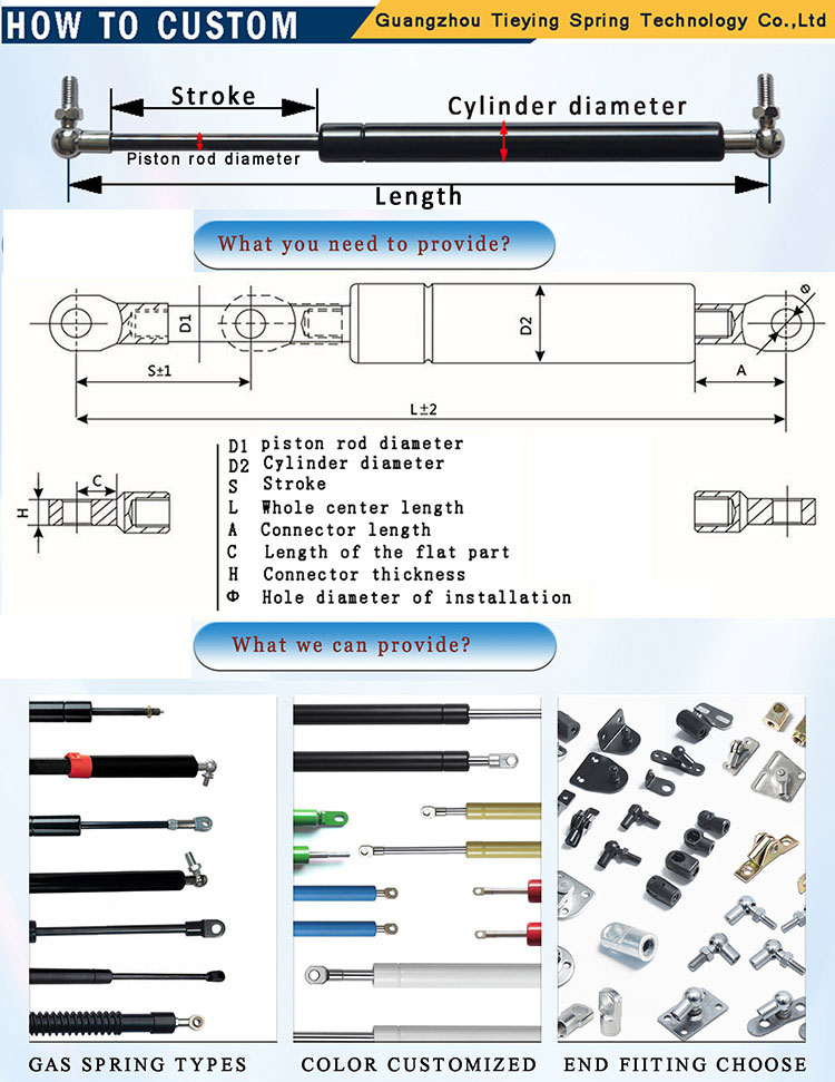 Guangzhou TieYing Spring Co.,Ltd. is a professional manufacturer of gas spring. TY range of product including : Compression Gas Spring, Dampers, Locking Gas Spring and Tension Gas Spring. Seamless steel, Stainless steel 304 and 316 alternative can be made for all our products. Certification including : SGS 200.000 Cycles Durability Test, ROHS, T16949, ISO9001.Our product are widely used for automobile, medical equipment, machinery, and furniture applications and so on.