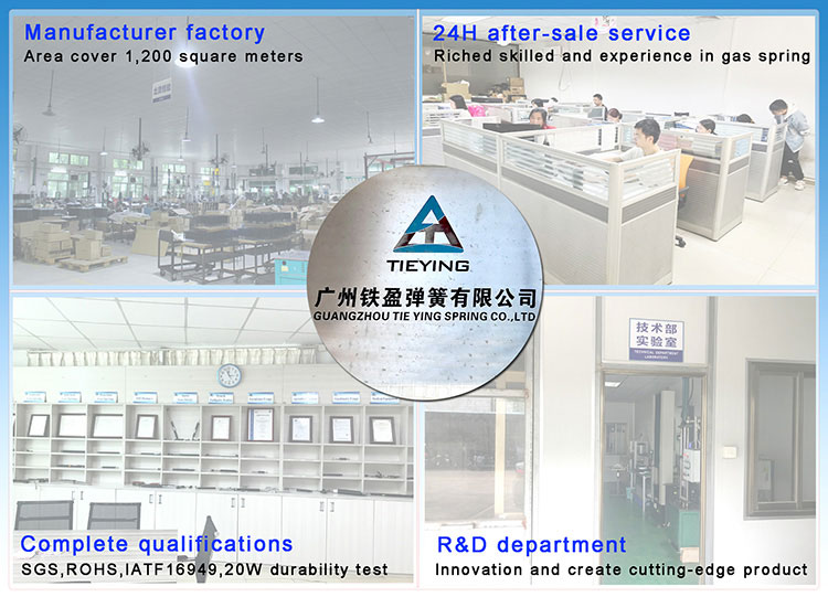 We are Guangzhou Tieying Gas Spring Co.,Ltd is established in 2002, which is located in Nansha District,Guangzhou,Guangdong .Mainly sell to USA,Russia and Mexico and so on,and we have certificates included SGS 200,000 Cycles Durability Test, ROHS etc..